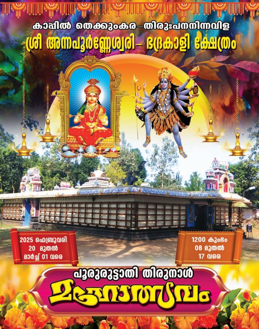 കാപ്പിൽ തെക്കുംകര പനനിന്നവിള അന്നപൂർണേശ്വരി ഭദ്രകാളി ക്ഷേത്രത്തിലെ പൂരുരുട്ടാതി തിരുനാൾ മഹോത്സവം 2025 ഫെബ്രുവരി 20 മുതൽ മാർച്ച് 1 വരെ നടക്കും. ക്ഷേത്ര തന്ത്രി സുരേഷ് ഭട്ടതിരിപ്പാട്, മേൽശാന്തി ഗണേഷ് പോറ്റി എന്നിവർ കാർമികത്വം വഹിക്കും.