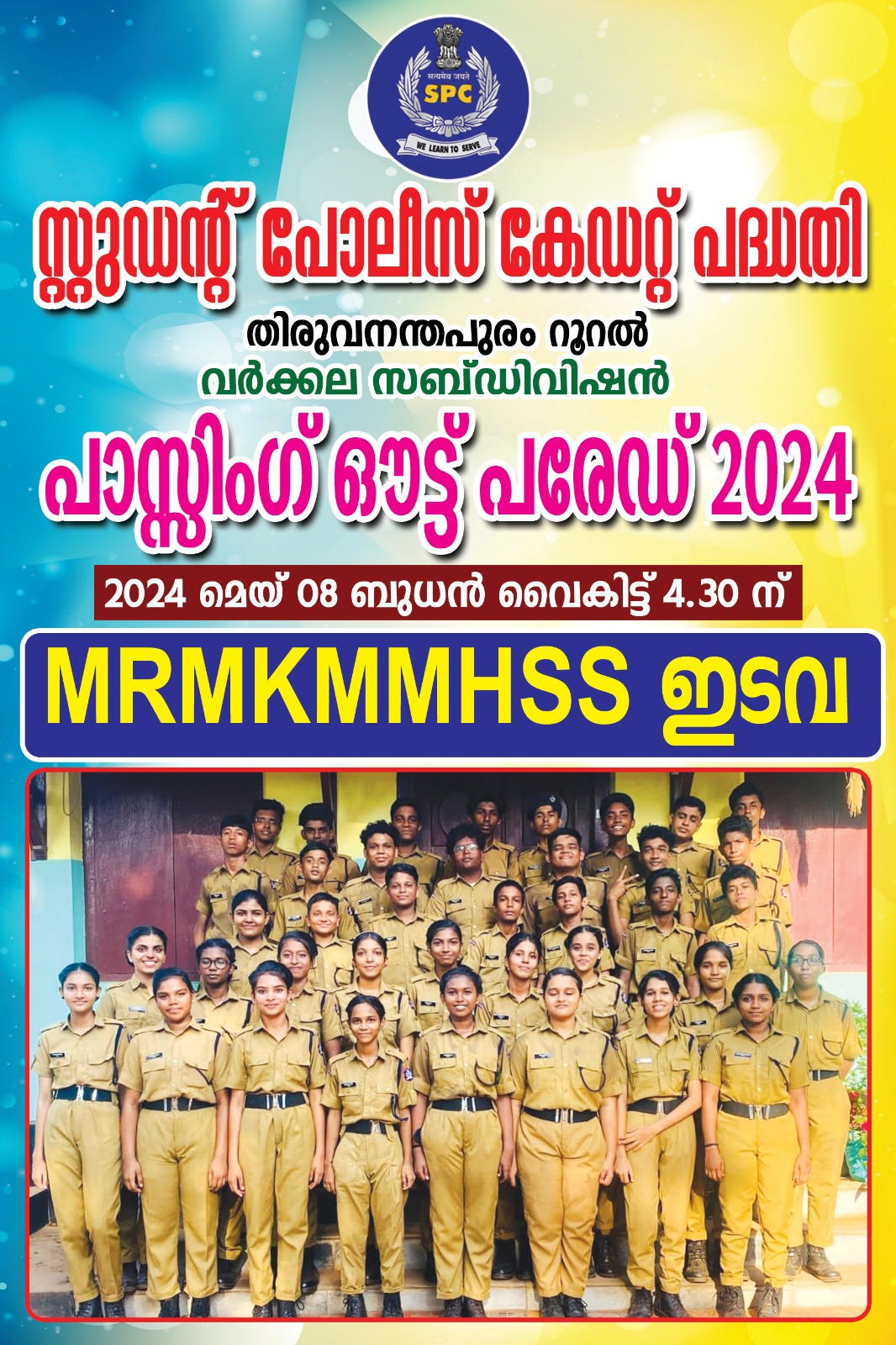 (SPC) സ്റ്റുഡന്റ് പോലീസ് കേഡറ്റ് പദ്ധതി – തിരുവനന്തപുരം റൂറൽ വർക്കല സബ്ഡിവിഷൻ പാസ്സിംഗ് ഔട്ട് പരേഡ് 2024 മെയ് 08 ബുധൻ വൈകിട്ട് 4.30 ന് MRMKMMHSS ഇടവയില് വെച്ച് നടക്കും.